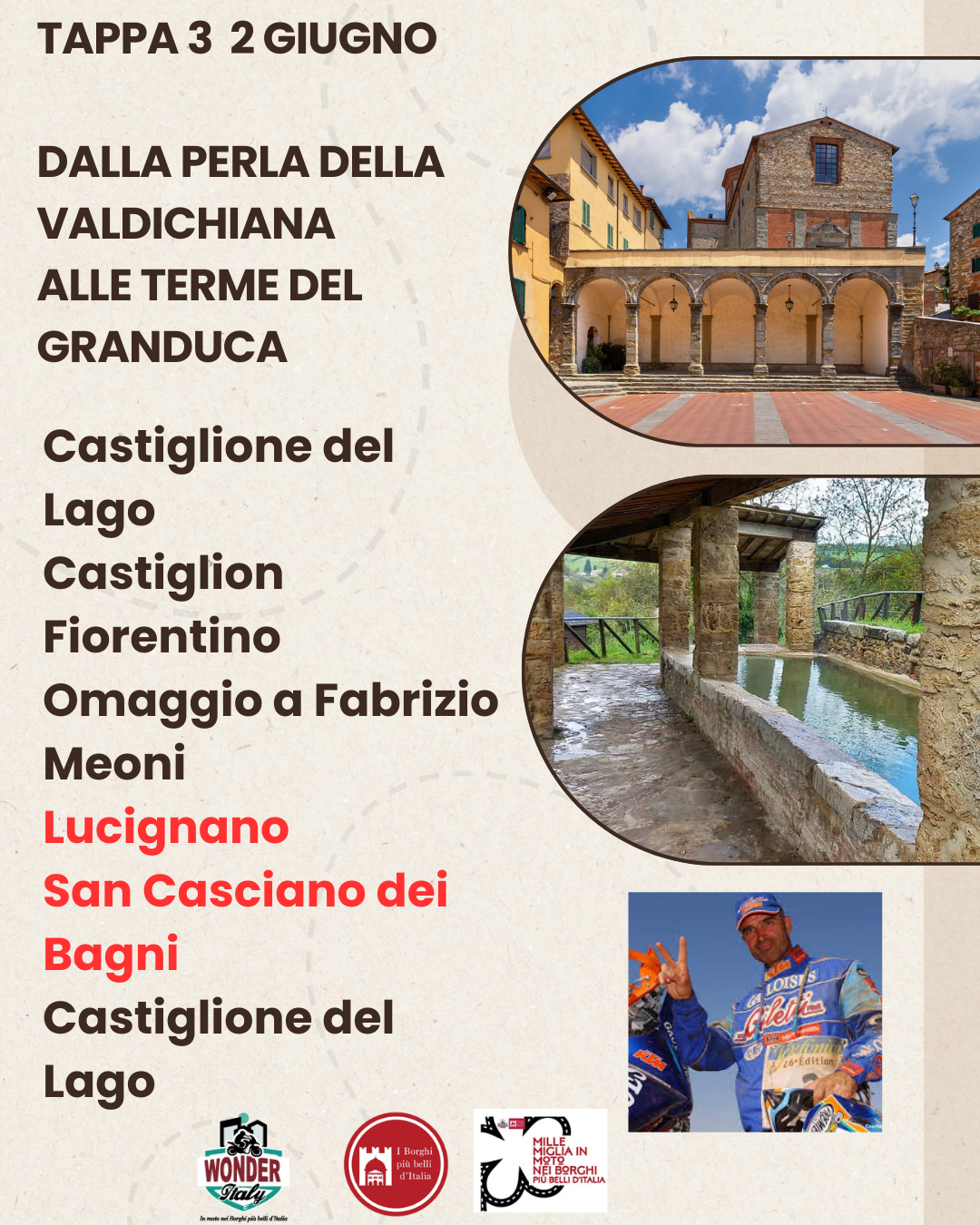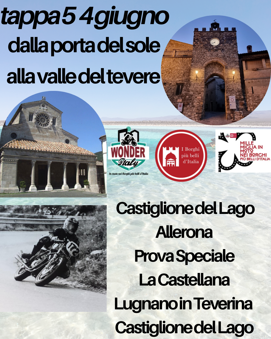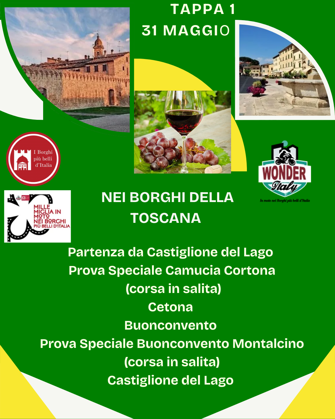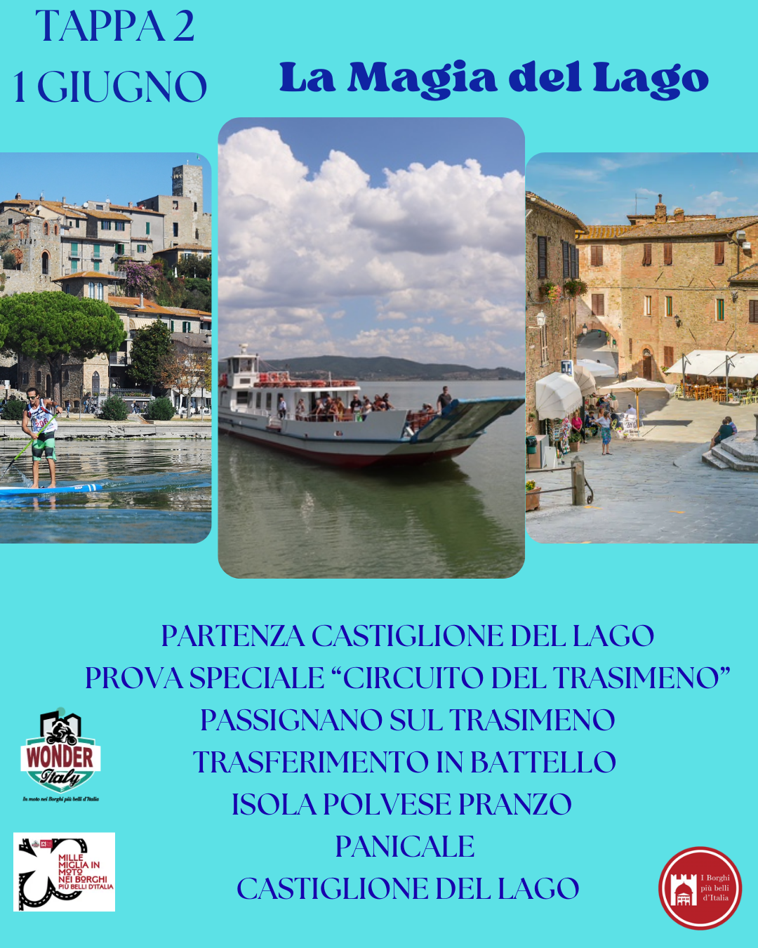 Il Borgo dove faremo base per l’intera durata della manifestazione è Castiglione del Lago dove arriveremo nella serata del 30 maggio e dove sarà allestita un’area di accoglienza ed un “parco chiuso” dove potranno essere parcheggiati i mezzi al seguito.